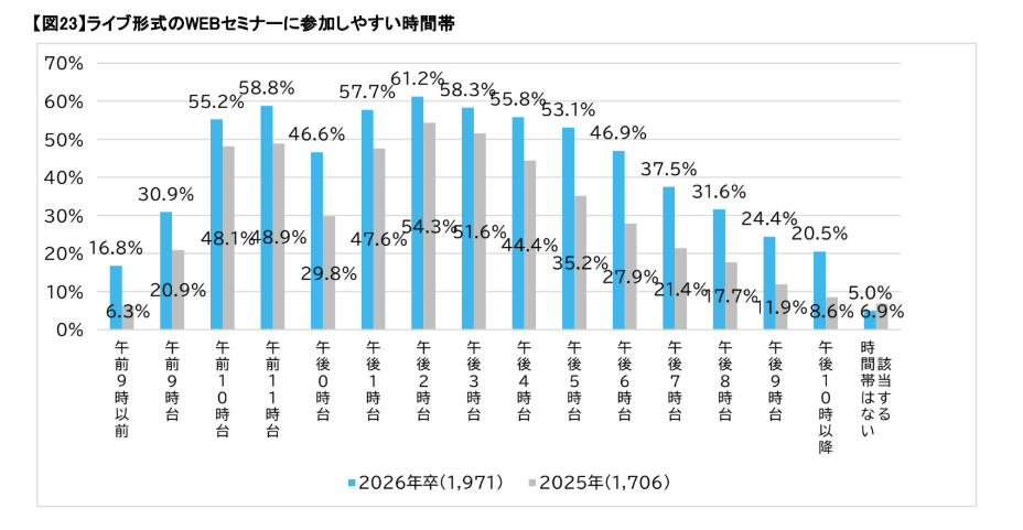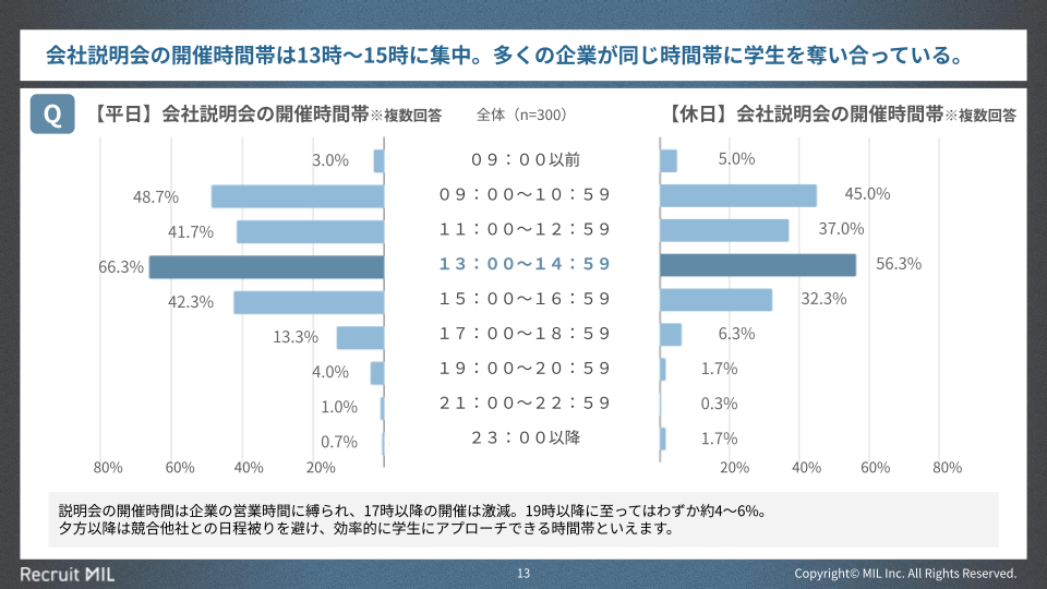 実際、MIL株式会社が26卒採用に携わる人事採用担当者約300社を対象に行った『説明会白書』の調査では、平日の会社説明会開催時間帯として最も多く選ばれたのが「13:00〜14:59」で、実に66.3%の企業がこの時間帯に集中していることが明らかになっています 。