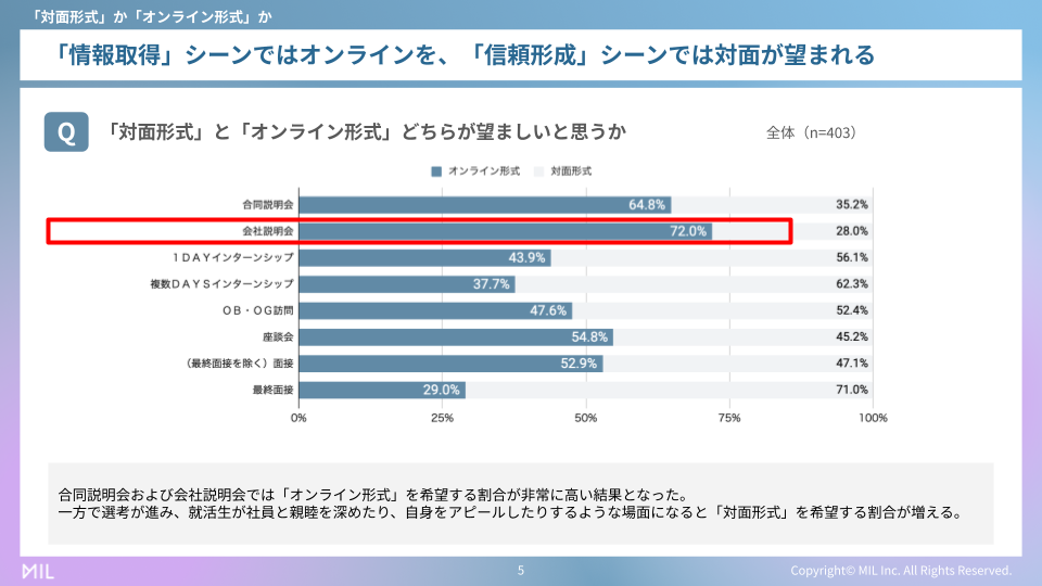 MIL株式会社の調査によれば、学生が「どちらの形式を望むか」という問いに対し、会社説明会においてはオンライン形式を希望する割合が72.0%と圧倒的多数を占めています。情報収集の効率を重視する現代の学生にとって、移動コストのないオンライン形式は合理的な選択です。