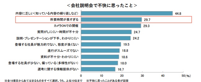 「充実した説明会にしたい」という企業の思いから、情報を詰め込みすぎてしまう担当者は少なくありません。しかし、キャリタスの調査によれば、学生が参加したセミナーで「不快に思ったこと」の第2位は「所要時間が長すぎる(29.7%)」です 。 伝える量を増やすほど、学生の処理能力は限界を迎えます。