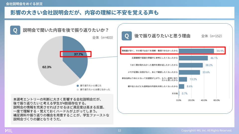 さらに、情報量が多すぎると「その場で理解しきれない」という問題も発生します。MIL株式会社の調査では、説明会の内容を「後で振り返りたい」と感じた学生が37.7%にのぼり、その理由の第1位は「情報量が多く、その場で全てを理解・整理できなかった(55.9%)」でした。