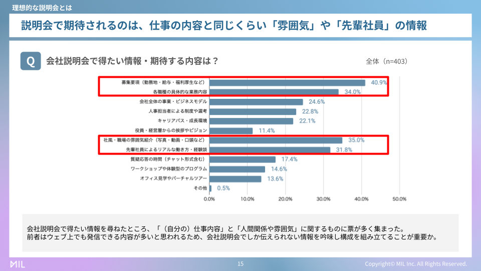 MIL株式会社のZ世代400名調査の中で「会社説明会で得たい情報・期待する内容」を学生に聞いたところ、上位には「社風・職場の雰囲気紹介(35.0%)」「先輩社員によるリアルな働き方・経験談(31.8%)」がランクインしており、募集要項(40.9%)・各職種の業務内容(34.0%)と並ぶ水準で支持されていました。