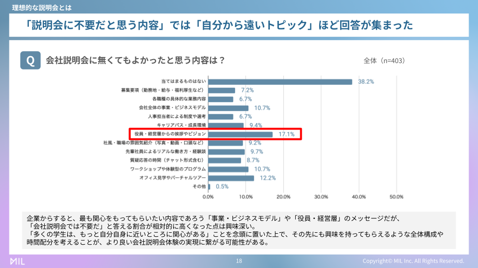 一方で「説明会に無くてもよかったと思う内容」を同じく学生に尋ねると、特定コンテンツの中で最も回答が集まったのが「役員・経営層からの挨拶やビジョン(17.1%)」でした。企業側が「大切なメッセージ」として時間を割きがちな役員挨拶が、学生からは最も「不要」と判断されているという、鮮明なギャップが浮かび上がります。