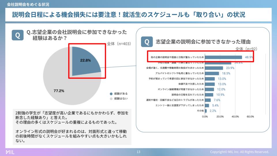 休日においても同様に「13:00〜14:59(56.3%)」が最多となっており、曜日を問わず”午後一番”に企業が殺到している実態が浮き彫りになりました。一方で、学生側のデータを見てみるとこの「激戦区」に説明会を設定することの深刻さをを明確に示しています。なんと、志望企業の説明会に「参加できなかった経験がある」と答えた学生が22.8%にのぼっています。つまり、2割以上の学生が、志望企業の説明会に参加する機会そのものを失っているのです。
