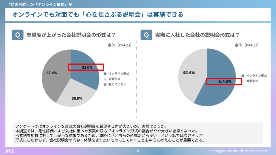 一方で「志望度が上がった説明会の形式」を問うと、オンラインが32.0%・対面が26.6%と、その差はわずか5.4ポイントにとどまります。さらに「実際に入社した会社の説明会形式」は、オンライン57.6%・対面42.4%と、ほぼ拮抗した結果となっています。