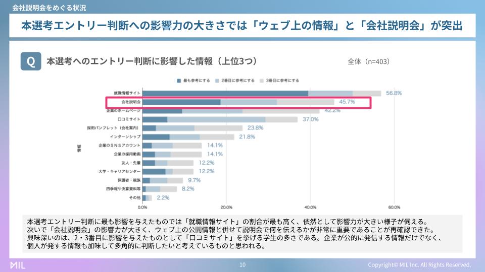 また、学生の本選考へのエントリー判断において、会社説明会は影響力の大きい情報源の一つであることが分かっています。実際に弊社の調査では、「本選考へのエントリー判断に影響した情報(上位3つ)」として、就職情報サイトに次いで「会社説明会」が高い割合を占めており、Webの情報と並んで重要な判断材料になっていることが読み取れるでしょう。