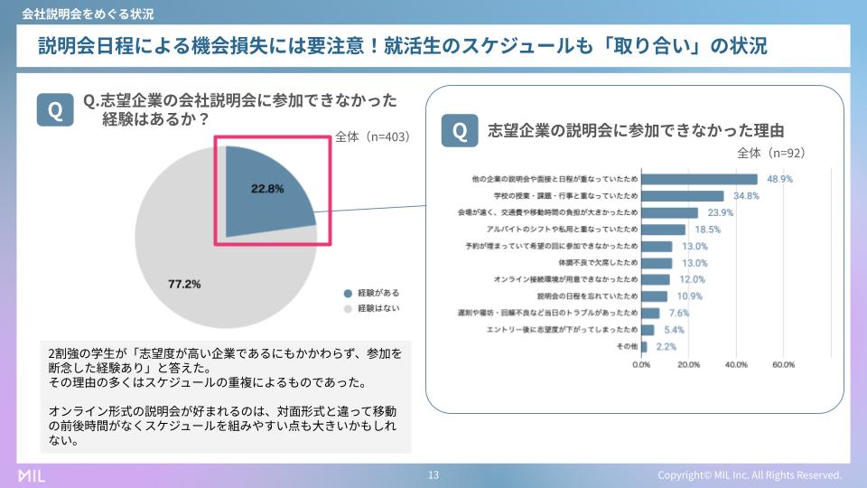 また、先ほどのZ世代調査においては、2割強の学生が「志望度が高い企業であるにもかかわらず、会社説明会への参加を断念した経験がある」と回答しています。