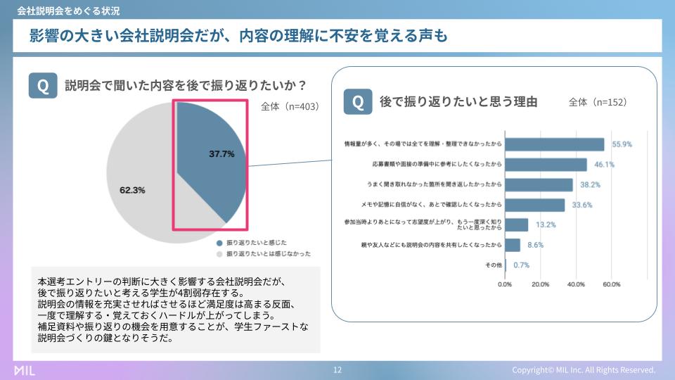 当社の調査では、説明会で聞いた内容を「後で振り返りたい」と感じた学生が4割弱存在することが分かっています。