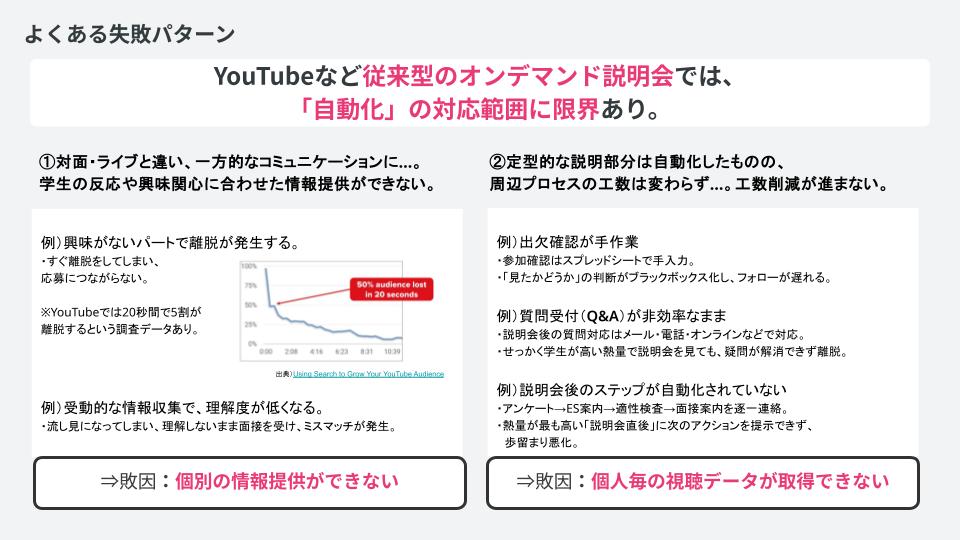 - 個別の視聴状況(出欠)が把握しにくい:誰がどこまで視聴したのかを、選考プロセスと結びつけて把握しづらい。
