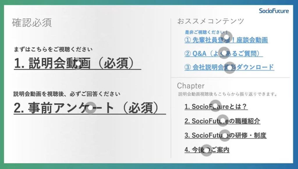 説明会の情報を充実させることで満足度が高まる一方、一度の参加だけで理解し、覚えておくことのハードルが上がる側面もあります。会社説明会動画を用意し、補足資料や振り返りの機会を設けることは、学生が自分のペースで情報を整理できる環境づくりにつながります。