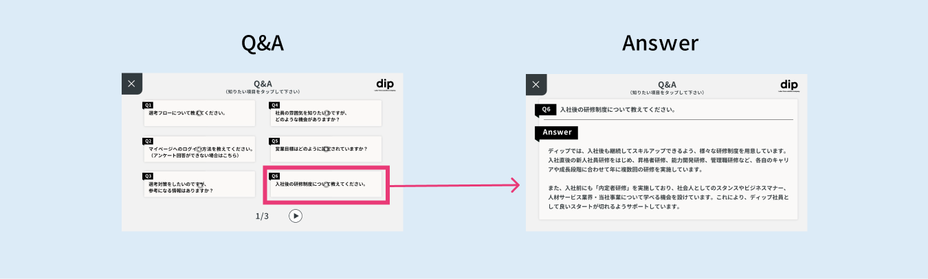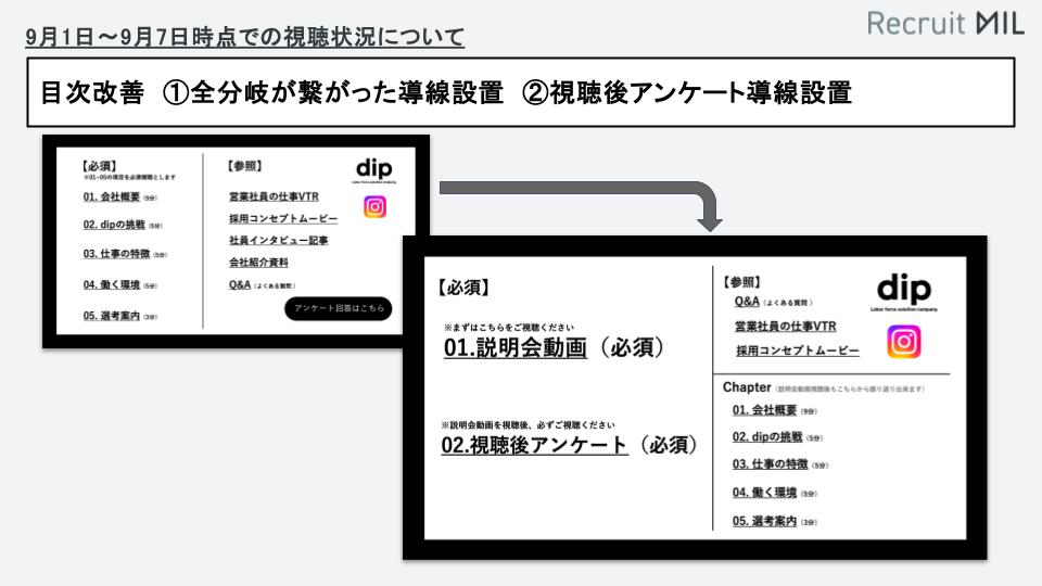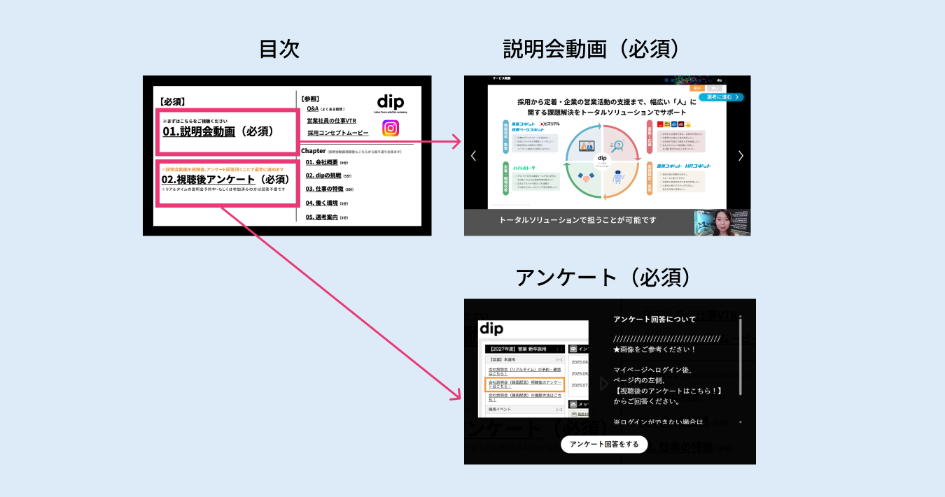 他社と比較して「ディップ」がどのような特徴のある会社なのか、わかるようにまとめました。学生の立場でも「最新の組織」や「仕事の説明」を分かるように説明することを意識して制作しました。また個々の学生が自身の興味や理解度に合わせて関連コンテンツを閲覧できるよう、弊社が過去に制作した「営業社員の仕事VTR」や「採用コンセプトムービー」などのリンクも掲載しています。