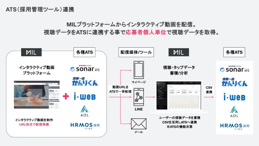 オンライン上での効果的な情報発信による「内定承諾への歩留まり改善」を目的として、複数の場面で活用しています。また今回Recruit MILを導入するにあたり、視聴データをより有効に活用するために、ATSツールも導入しました。視聴データをATSを連携させることで、応募者個人単位での視聴データの取得・活用が可能になっています。