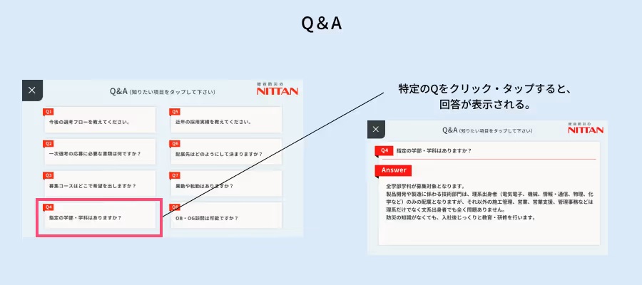 従来のアンケートの場合は「人事担当者に見られる」という前提で学生が回答するので、「建前」に近い回答になりがちでした。過去の説明会の中で「どの情報が気になったか?」をアンケートしたことはありますが、「職種」「研修」「福利厚生」などの大項目でしか聞いたことがありませんでした。今回、動画内に募集職種をいくつか並べており「この学生はどの職種に興味があるのか?」という個別の興味と、「視聴数の多い職種=学生の興味が高い」などといった全体傾向の両方を把握できるようになります。また、どの学生がどのQ&Aをタップ・クリックしているかもデータから分かりますので、興味に沿ったフォローが可能になりました。