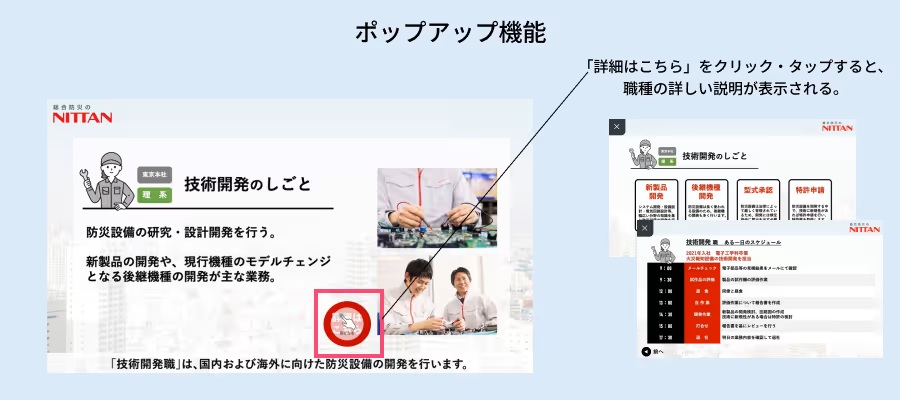 私は「自分たちで全て作らないといけないのかな……」と外部向けの動画制作にハードルの高さを感じていたのですが、しっかりとヒアリングの上ご提案をくださり、伴走していただきながらの制作でしたので、想像以上にスムーズに制作できたと感じています。インタラクティブ編集はMILさんが行ってくださり、ポップアップなどRecruit MILならではのインタラクティブ機能を使って、分かりやすい動画に仕上げていただきました。
